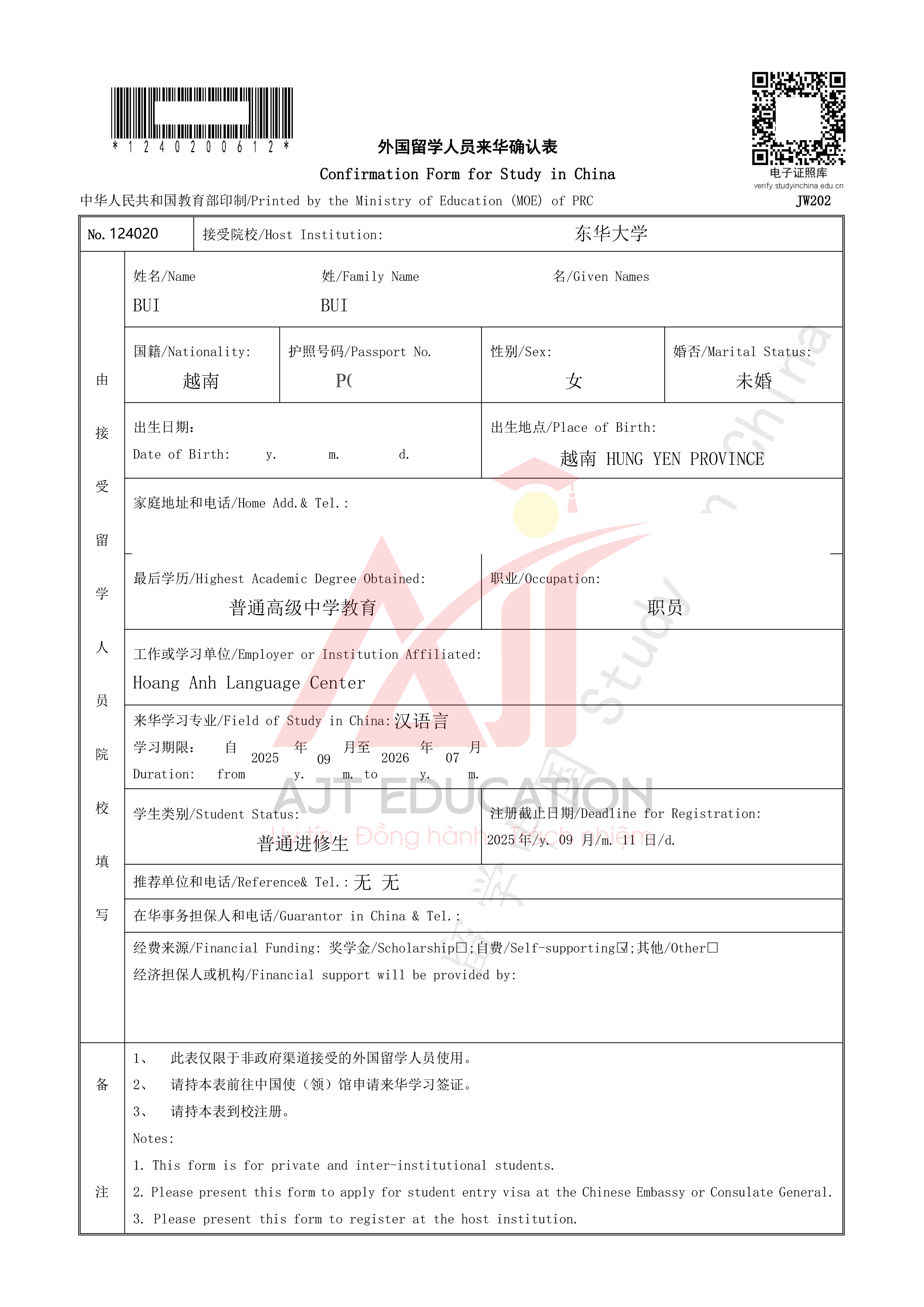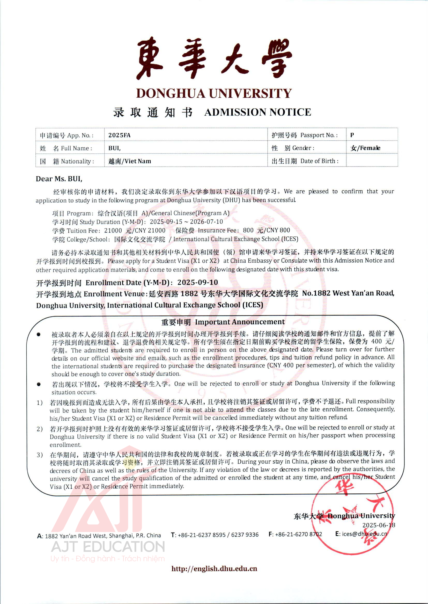 AJT EDUCATION xin gửi lời chúc mừng tới học viên đã xuất sắc nhận được giấy báo trúng tuyển (Admission Notice) và giấy JW202 hệ Ngôn ngữ từ Đại học Đông Hoa (Donghua University) – một trong những trường đại học trọng điểm và có chất lượng đào tạo hàng đầu tại Thượng Hải. Đây không chỉ là một thành tựu đáng tự hào trong hành trình học tập mà còn là bước ngoặt quan trọng mở ra cơ hội học tập và phát triển toàn diện tại một trong những kinh đô thời trang và kinh tế sầm uất.