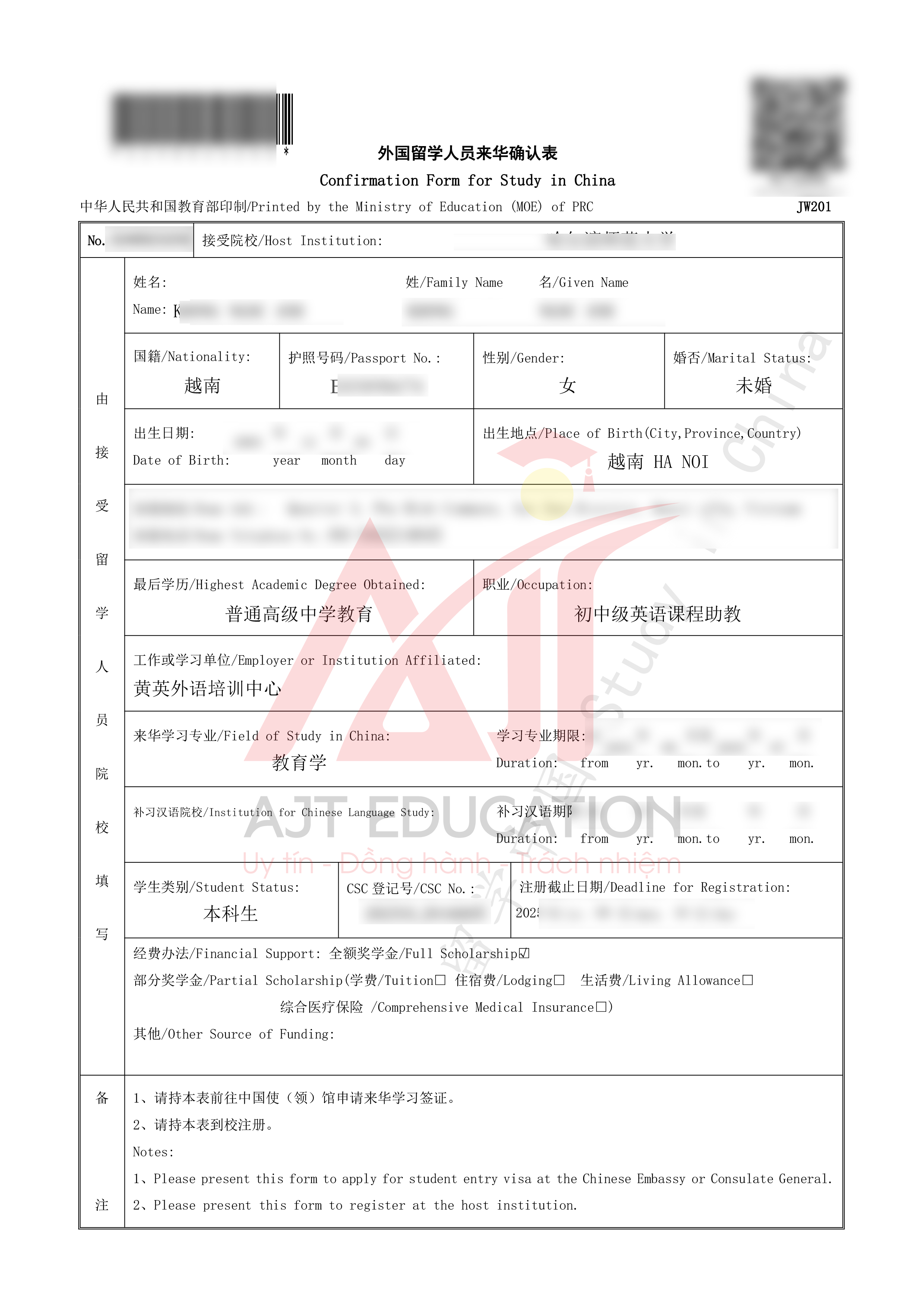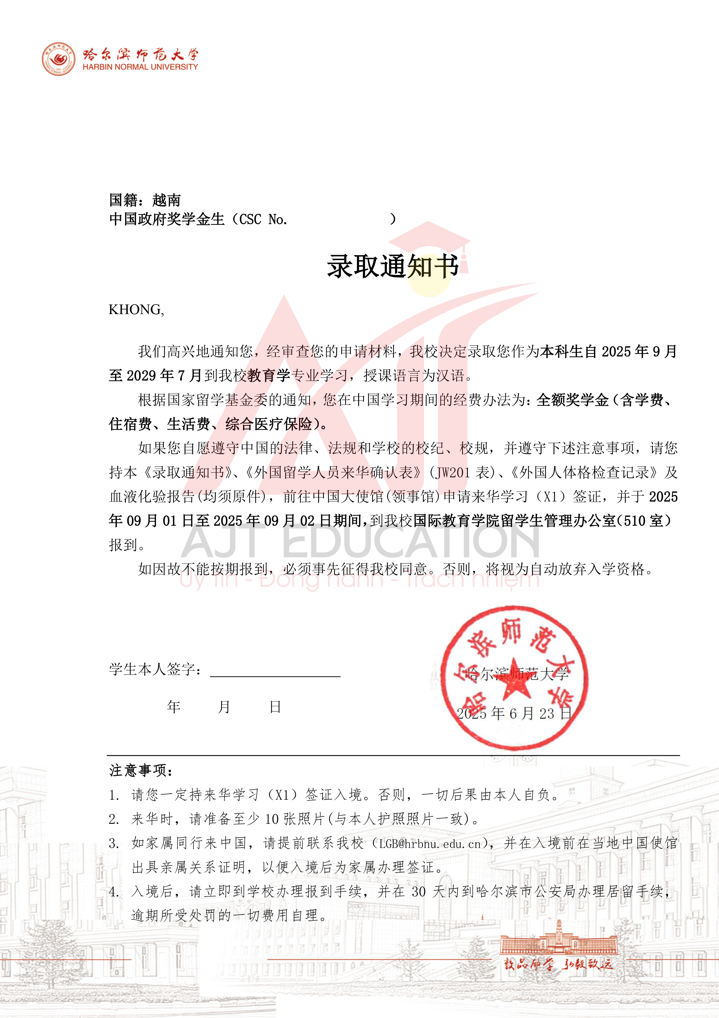 AJT EDUCATION xin gửi lời chúc mừng tới học viên đã xuất sắc nhận được giấy báo trúng tuyển (Admission Notice) và Học bổng Toàn phần (Full Scholarship) hệ Đại học chuyên ngành Giáo dục học từ Đại học Sư phạm Cáp Nhĩ Tân (Harbin Normal University) – một trong những trường đại học trọng điểm và có chất lượng đào tạo hàng đầu tại khu vực Đông Bắc Trung Quốc. Đây không chỉ là một thành tựu đáng tự hào trong hành trình học tập mà còn là bước ngoặt quan trọng mở ra cơ hội học tập và phát triển toàn diện tại môi trường giáo dục danh tiếng.
