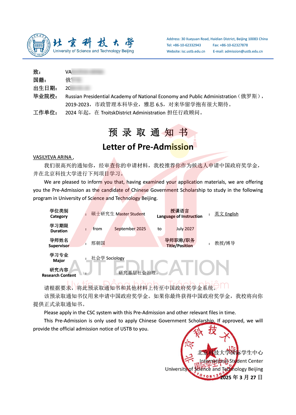 AJT EDUCATION xin gửi lời chúc mừng đầy tự hào tới bạn – gương mặt xuất sắc tiếp theo đã nhận được Thư Dự tuyển (Letter of Pre-Admission) hệ Thạc sĩ từ Đại học Khoa học Kỹ thuật Bắc Kinh (University of Science and Technology Beijing - USTB).
